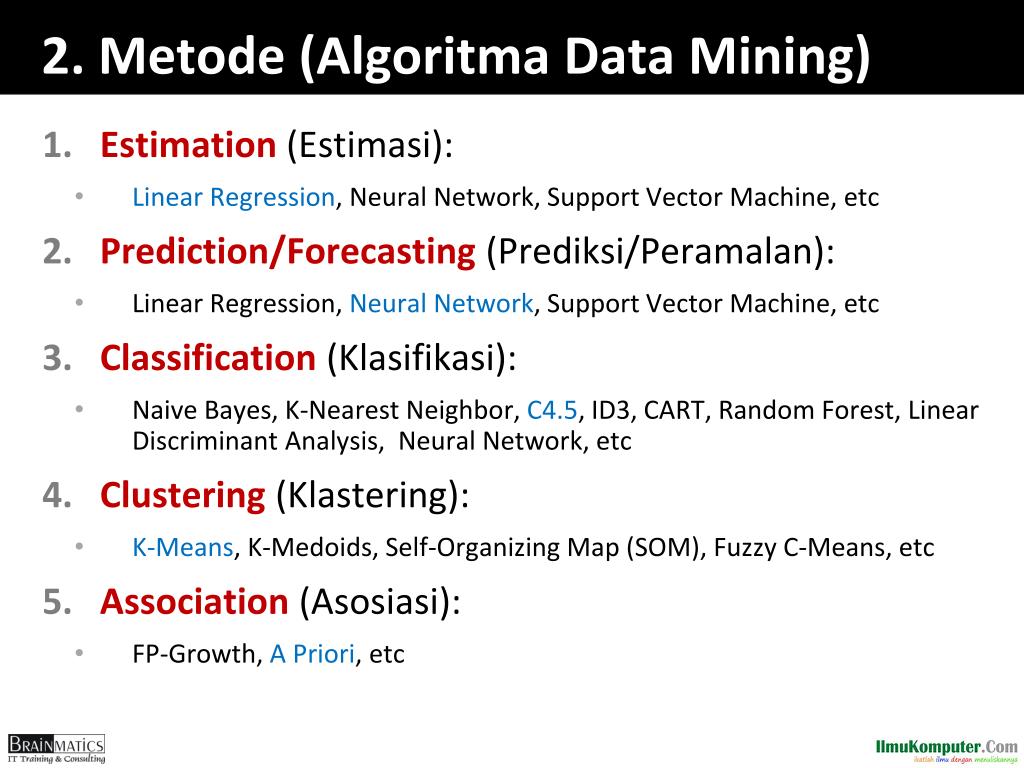 Fungsional data mining sepertikarakterisasi, asosiasi, klasifikasi dan. Proses yang dilakukan untuk mengekstrak pengetahuan dalam data mining adalah pengenalan pola, clustering, asosiasi, prediksi dan klasifikasi . Algoritma estimasi di mana label/target/class. Dengan perhitungan dan contoh kasus. Dan kasus ke dalam class yang mirip. Algoritma estimasi dan forecasting 6. Klasifikasi pasien kasus appendicitis menggunakan metode naive bayes pada. 4.4 algoritma estimasi dan forecasting. Klasifikasi merupakan salah satu teknik data mining dengan melihat pada kelakuan dan atribut dari kelompok yang telah didefinisikan (kusnawi, 2007). Hal ini hanya berpengaruh pada jumlah iterasi yang dilakukan. Pada bab 4 kita kan dikenalkan pada tool yang biasa digunakan dalam data mining seperti weka dan. Analisis cluster tidak seperti klasifikasi dan prediksi, yang menganalisis objek data yang diberi label kelas, clustering menganalisis objek data dimana . Tugas asosiasi dalam data mining adalah menemukan atribut yang muncul dalam satu waktu.